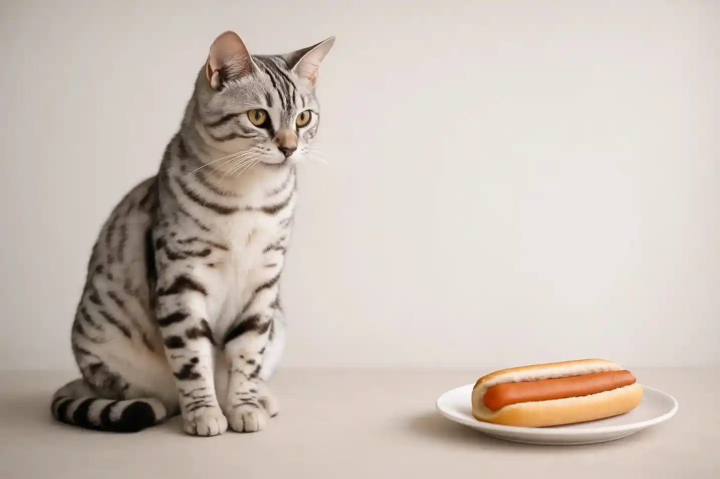 Silver Bengal cat observing a hot dog on a neutral background, representing questions about cats eating hot dogs.